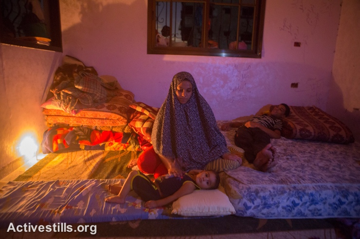 Members of the Atesh family sit in a room lighted by a candle in their partially destroyed home in Shujayea neighborood, Gaza City, September 5, 2014. Due to the Israeli attacks, the electricity infrastructure has been damaged and most homes have no electricity or water.