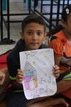 Afnane organised art classes for the children to enable them to express their experiences through their drawings. She deliberately gave them a free hand and avoided leading their creativity to see what would emerge from their wounded souls. The sensitivity and fragility that was conveyed by their images is striking. No images of violence or hate for these children. They drew butterflies, flowers, intact houses, blue skies and birds soaring far above them. They lost themselves in worlds far removed from the reality of theirs.