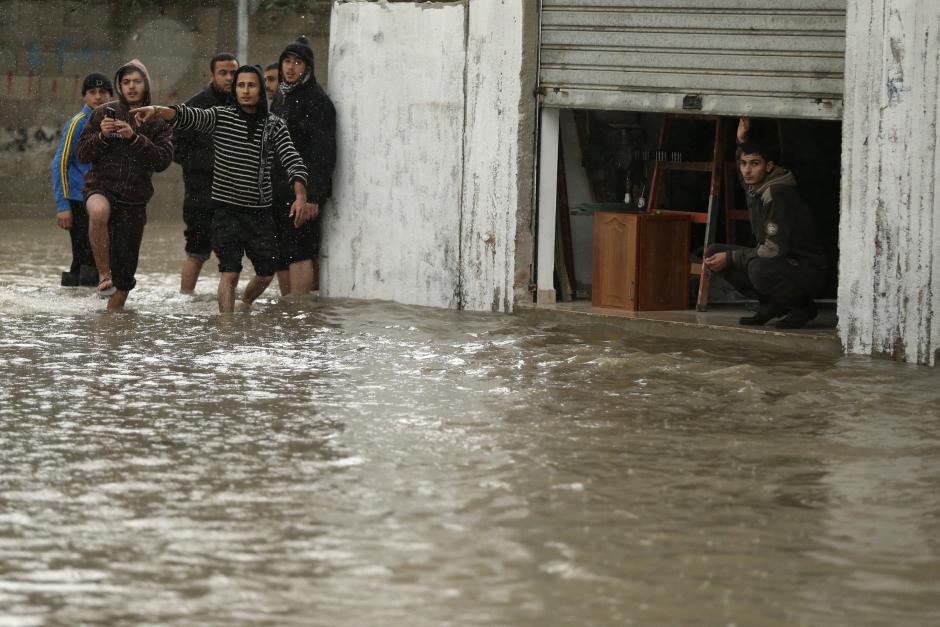 A man looks out of his shop as Palestinians walk through a flooded road following heavy rain in Gaza City November 27, 2014. MOHAMMED SALEM/REUTERS