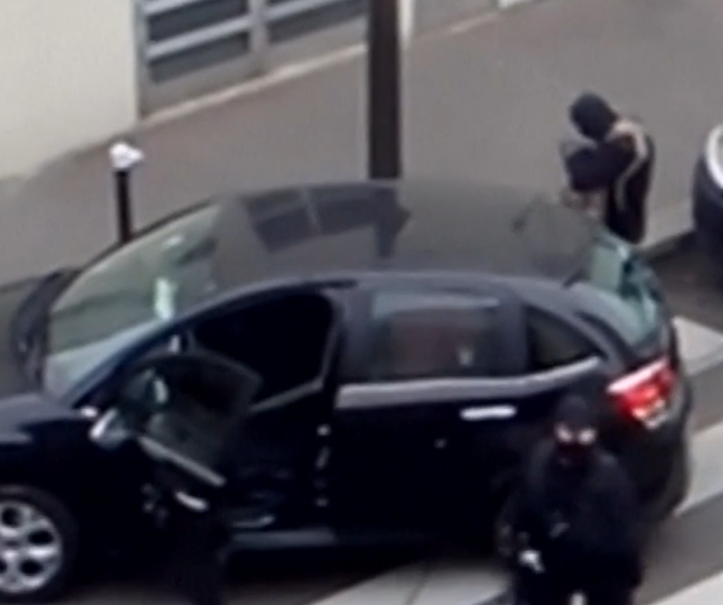 It does not explain however, why when one of the Kouachi brothers very clearly looks directly at the video taker he continues filming, nor why the Kouachi brother does not kill him as witness to their crimes unless that testimony is required to strengthen the official narrative. These attackers would have been pumped up from their killing spree, why would they spare a witness and why once they realise they are being filmed would they take their time to get into the car?