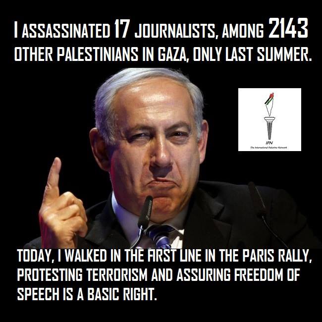 Does it not bother you to see Barack Obama – who demanded that Yemen keep the anti-drone journalist Abdulelah Haider Shaye behind bars, after he was convicted on “terrorism-related charges” in a kangaroo court – jump on the free speech ban wagon? Weren’t you sickened to see Benjamin Netanyahu, the prime minister of a country that was responsible for the killing of seventeen journalists in Gaza in 2014, attend the “unity rally” in Paris? Bibi was joined by Angela Merkel, chancellor of a country where Holocaust denial is punishable by up to five years in prison, and David Cameron, who wants to ban non-violent “extremists” committed to the “overthrow of democracy” from appearing on television.