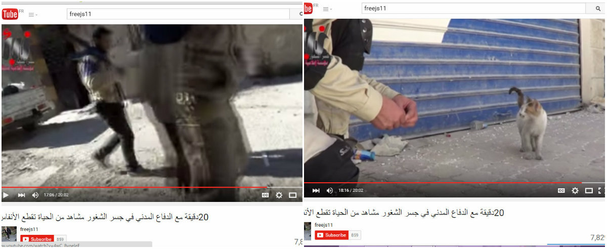 I will be covering the White Helmets in greater depth in a subsequent article but I just wanted to point out the obvious kitten parallels in their “advertising” campaigns. In one video the supposedly “unarmed” humanitarian heroes and miracle workers that are the White Helmets [according to their publicity] are filmed clearly carrying guns. A screen shot from this footage demonstrates how the film maker, perhaps aware of their faux pa[w]s, swiftly cuts from gun toting White Helmet operative to said operative fussing over a kitten that has conveniently appeared in shot to distract us and restore our faith in their “humanity”.