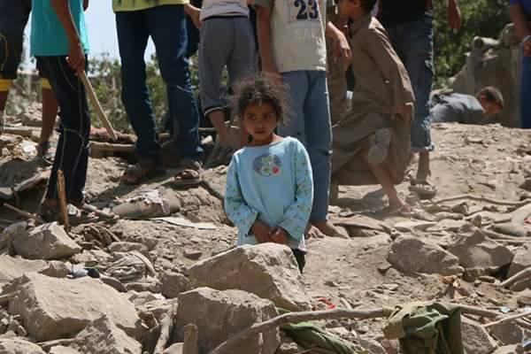 A little girl in the midst of the rescue workers, stands dazed and dishevelled. A dot of blue against the dust and stone, her face registers only shock and disbelief. She is the loneliness of Yemen, starkly silhouetted, alone against this backdrop of bloodshed and tears. Standing brokenly, defiantly against all that is wrong with the world. Silently suffering, voiceless, wordless, screaming inside for the help that never comes. Crying the tears that creep through the dust and dry unnoticed on the graves of their fallen.