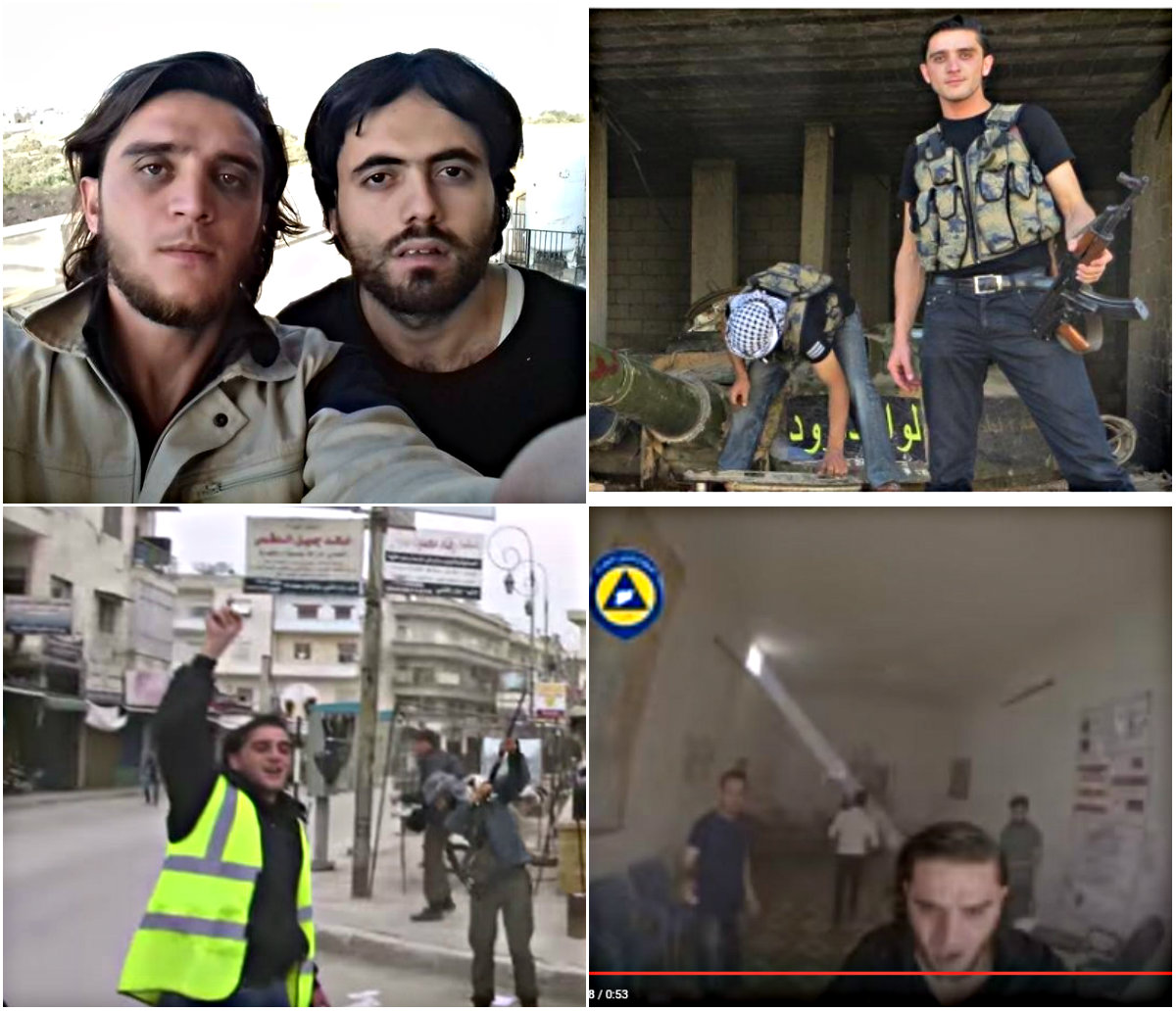 collage Musawiya Published October 26, 2015 at 1200 × 1032 in Part II – Syria’s White Helmets: War By Way of Deception ~ ‘Moderate Executioners’ ← Previous Next → Top left: Musawiya Agha Hassan in White Helmet mode. Top Right: As Al Nusra mercenary on tank in Idlib. Bottom left: celebrating with Al Nusra terrorists. Bottom right: Screen shot from alleged Russian air strike on hospital in Sharmine, Idlib.