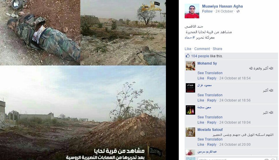Screenshot (448) Published October 26, 2015 at 955 × 550 in Part II – Syria’s White Helmets: War By Way of Deception ~ ‘Moderate Executioners’ ← Previous Next → Muawiya Hassan Agha Facebook page 24/10/2015 celebrating death of a Syrian Army soldier.