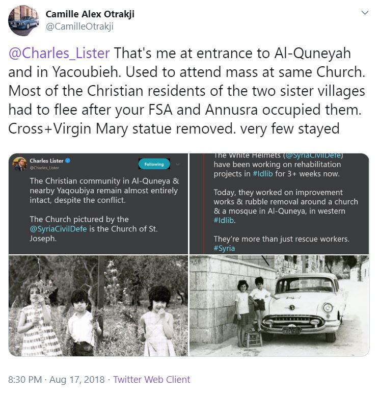 In 2018, “moderate rebel” promoter Charles Lister attempted to claim that the White Helmets were benevolent caretakers of Christian artefacts and communities in Yakubiyah. This cynical remodelling of reality was swiftly exposed by former resident and Syria commentator, Camille Otrakji.