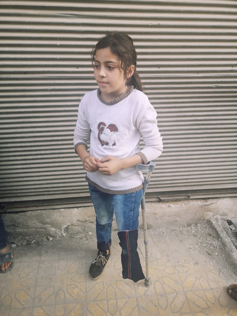 Hamoud is 19 years old, his leg was blown off by a terrorist mortar three years ago, in Khalidiyah, Aleppo . He has had a prosthetic limb fitted twice but they don’t fit correctly and are too painful to wear so he prefers to use his crutches.