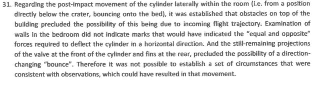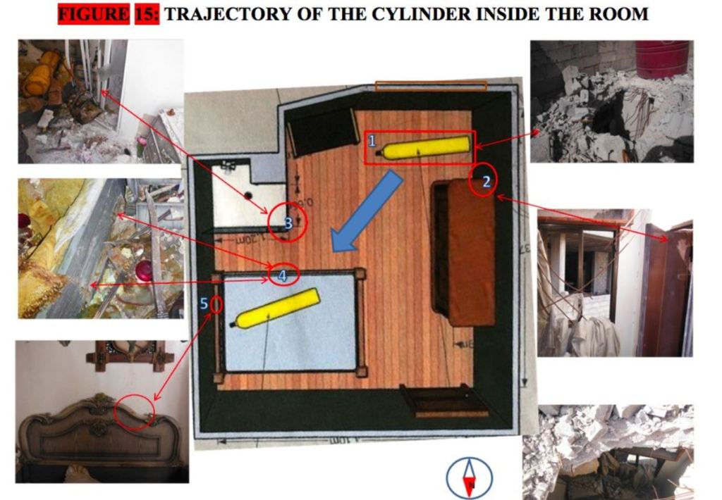 2: To date there remains no adequate explanation as to how the cylinder a location 4 managed to alter trajectory and land on the bed. @bellingcat’s recent attempted rebuttal ignores this entirely whilst suppressed OPCW documents confirm the trajectory is implausible