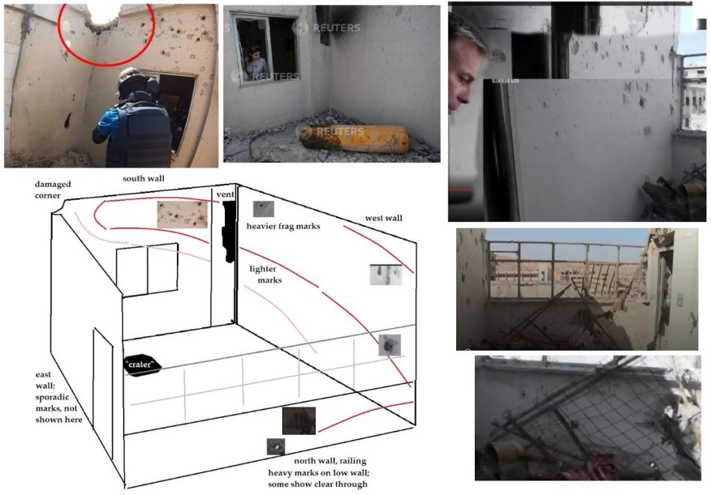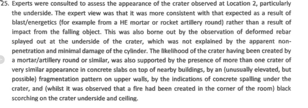 4: Regarding the cylinder at location 2, both Bellingcat and the final OPCW report ignore the obvious evidence that a mortar shell caused the damage including blast fragmentation patterns and twisted metal bars.