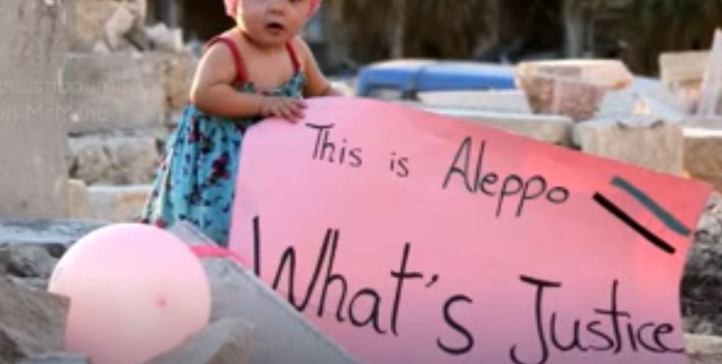 Dedicated to Waad’s daughter, the documentary can only be described as a grotesque misrepresentation of life in East Aleppo under the tyranny of sectarian armed groups. Anyone watching this movie will assume that East Aleppo was the “free country” as described by Waad, besieged and preyed upon by the Syrian government. The film literally airbrushes Nusra Front from the scenario. Groups like Nour al-Din al-Zenki are not referred to, their crimes go unmentioned.