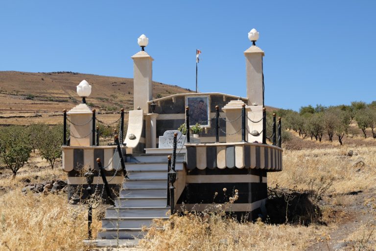 Our journey began in Damascus. We left early in the morning and headed due south before taking the road that brought us to the east of Sweida city and to the villages that form a chain north to south, only about 1km apart. As we entered the province of Sweida, we began to see the elaborate memorials to martyrs killed in Syria’s war against Western-sponsored terrorism. Our guide told us that these beautiful monuments are in honour of the soldiers who have given their lives in defence of their homeland. Many of these impressive structures are placed at the entrance to villages “so their names are remembered for eternity by all those who live because they died“.