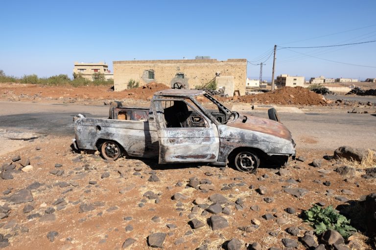 A car at the entrance to Shbeki village had been targeted by ISIS terrorists as it was attempting to ferry injured civilians to safety. (Photo: Vanessa Beeley)