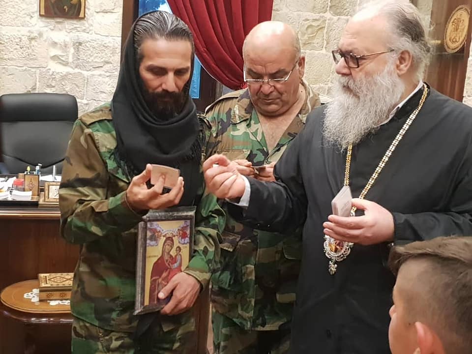 Nabel Alabdalla, commander of the Al Sqeilbiyyeh National Defence Forces (left) with Orthodox Patriarch of Antioch, John Yazizi (right) and Gtas Awad of the Mhardeh National Defence Forces (center)