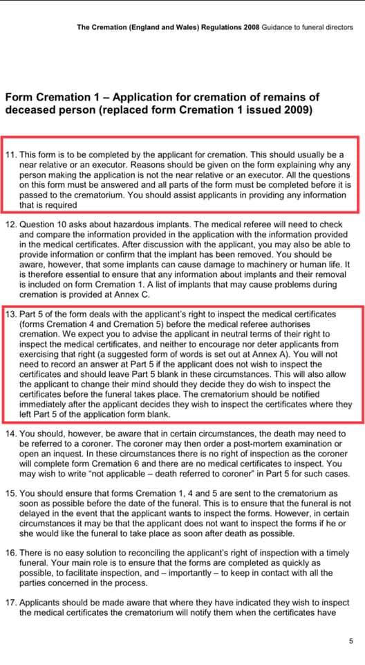 Did you know that the UK Government have removed Form 5 of the Cremation Certificate for deaths relating to Covid-19 under the Coronavirus Act which is the form that the relative who registers the death must be given as it enables them to see and query the death certificate before cremation.