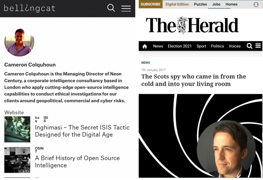 Former contributor Cameron Colquhoun’s past is even more suspect. Colquhoun spent a decade in a senior position in GCHQ (Britain’s version of the NSA), where he ran cyber and Middle Eastern terror operations. The Scot specializes in Middle Eastern security and also holds a qualification from the U.S. State Department. None of this, however, is disclosed by Bellingcat, which merely describes him as the managing director of a private intelligence company that “conduct[s] ethical investigations” for clients around the world — thus depriving readers of key information they need to make informed judgments on what they are reading.