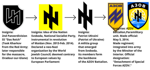 These militias had been operating in the Donbass since 2014, with Western support. Even if one can argue about the term “Nazi,” the fact remains that these militias are violent, convey a nauseating ideology and are virulently anti-Semitic…[and] are composed of fanatical and brutal individuals. The best known of these is the Azov Regiment, whose emblem is reminiscent of the 2nd SS Das Reich Panzer Division, which is revered in the Ukraine for liberating Kharkov from the Soviets in 1943, before carrying out the 1944 Oradour-sur-Glane massacre in France.