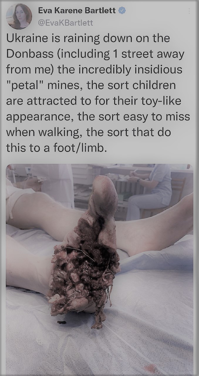 Eva Bartlett has tweeted about the hideous injuries caused by these mines and recorded her experiences on her Telegram channel: