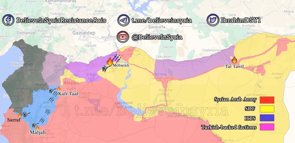 Under the same pretext of “Tribal Support”, Turkish-backed “Syrian National Army” (SNA) attacked the Syrian Arab Army points next to the SDF points in Tal Al-Tawil and Tal Tamr in Hasakah countryside. They controlled several points and cut off the M4 highway after the SDF militia fled.