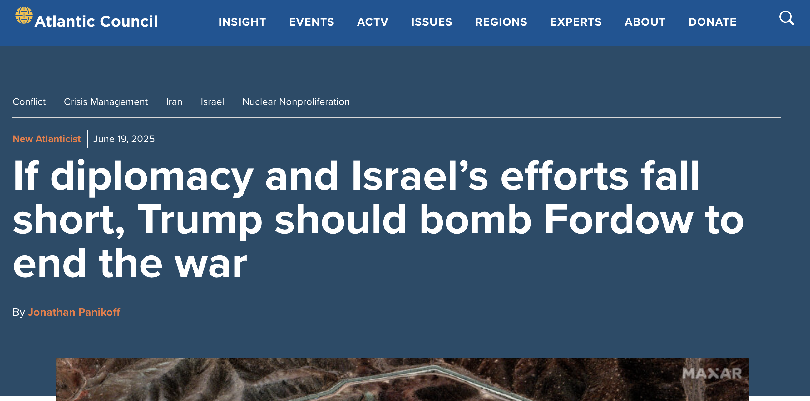 Jonathan Panikoff openly advocates bombing Iran’s Fordow nuclear facility, a sovereign site, on AtlanticCouncil just because Trump’s fake diplomacy didn’t give Israel the upper hand. This isn’t analysis. It’s criminal incitement.