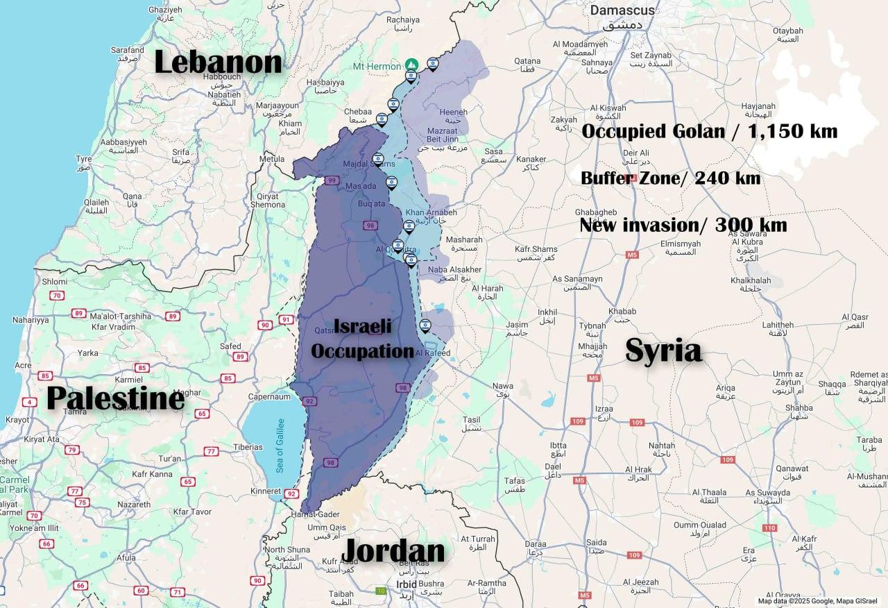 The demilitarised zone covers an area of approximately 235 km², while the newly occupied territories amount to around 310 km², in which Israel has established 11 new military outposts. This is in addition to the Golan Heights, which Israel has unlawfully occupied since 1967.