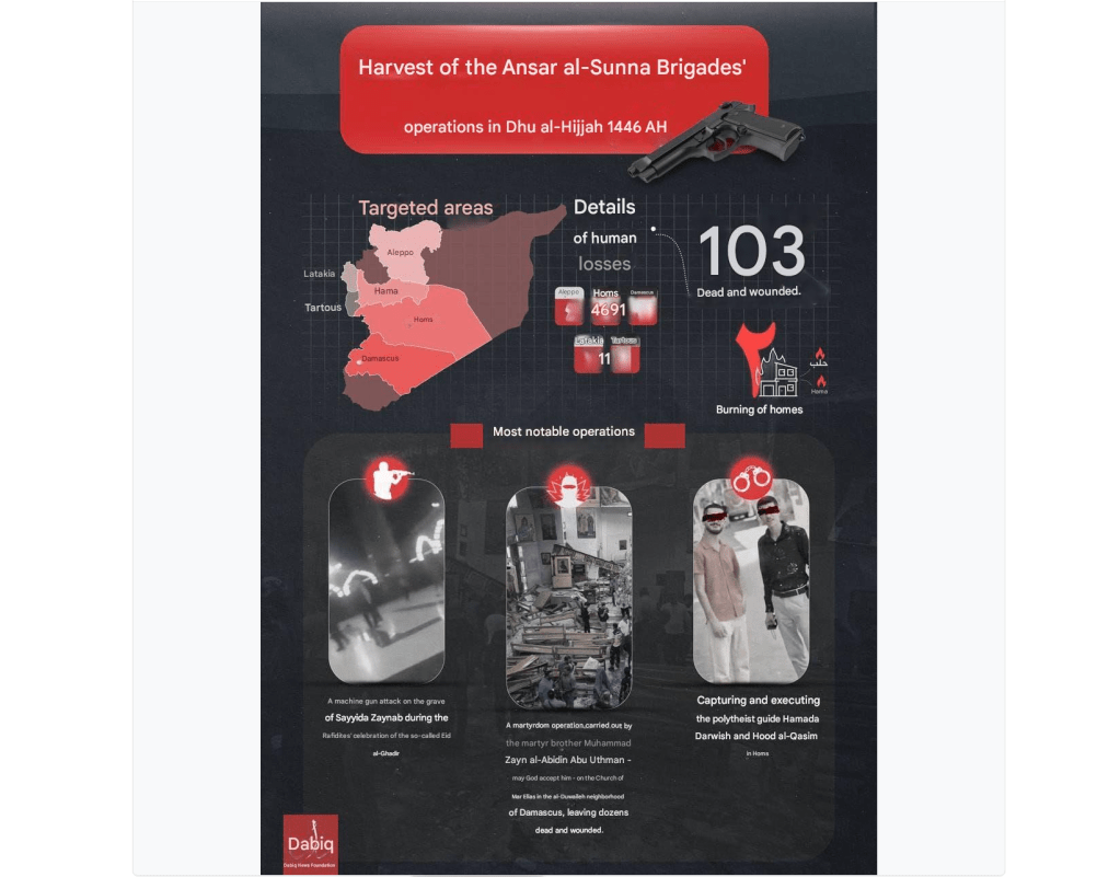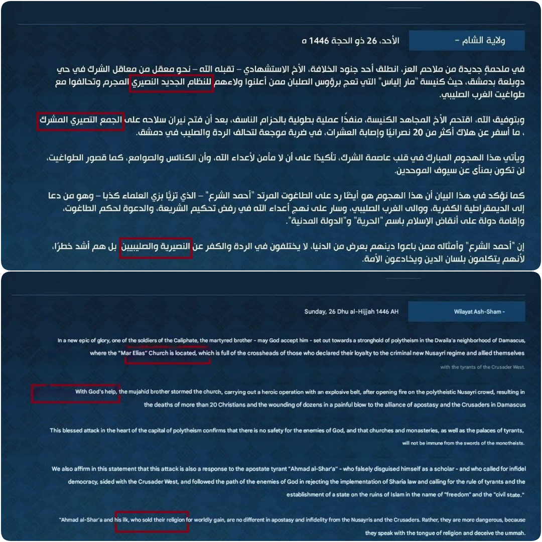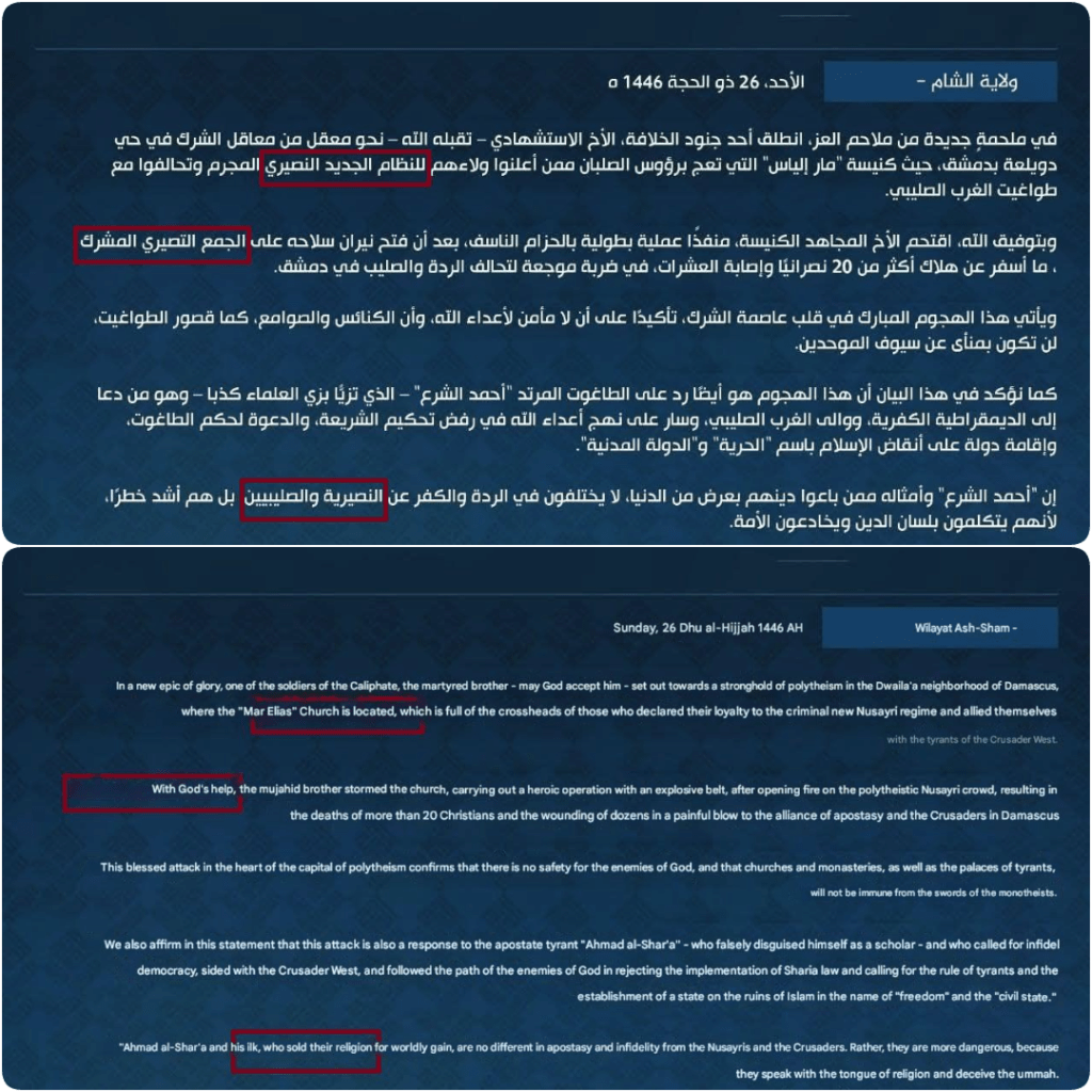 A statement then appeared from a Takfiri group called Saraya Ansar al-Sunna (SAS) taking responsibility for the attack. They accused “Christians of Damascus” of provocations that led to the attack. They referred to a previous incident where the group drove into the Christian areas demanding conversion to Islam. The perpetrator of the operation was named as Muhammad Zayn al-Abidin (Abu Uthman). The Jolani narrative was dismissed as fabricated. The group called on Syria’s minorities to “repent before it is too late” and said further attacks against Christians and other minorities would be launched.