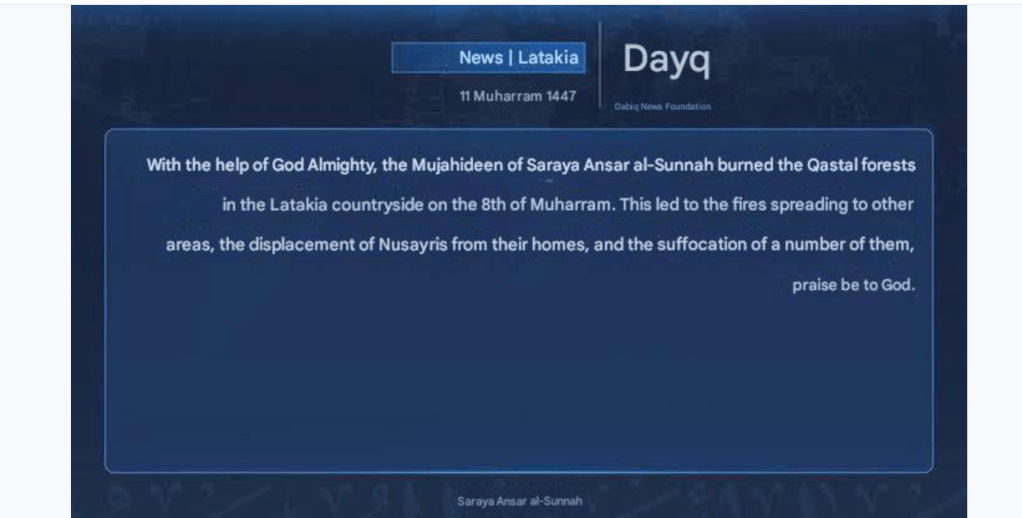 Videos are simultaneously circulating of HTS arsonists previously setting fire to forests in Qardaha, Latakia, another more recent incident here. As much as Jolani attempts to deflect blame, the social media accounts of his militia betray him.