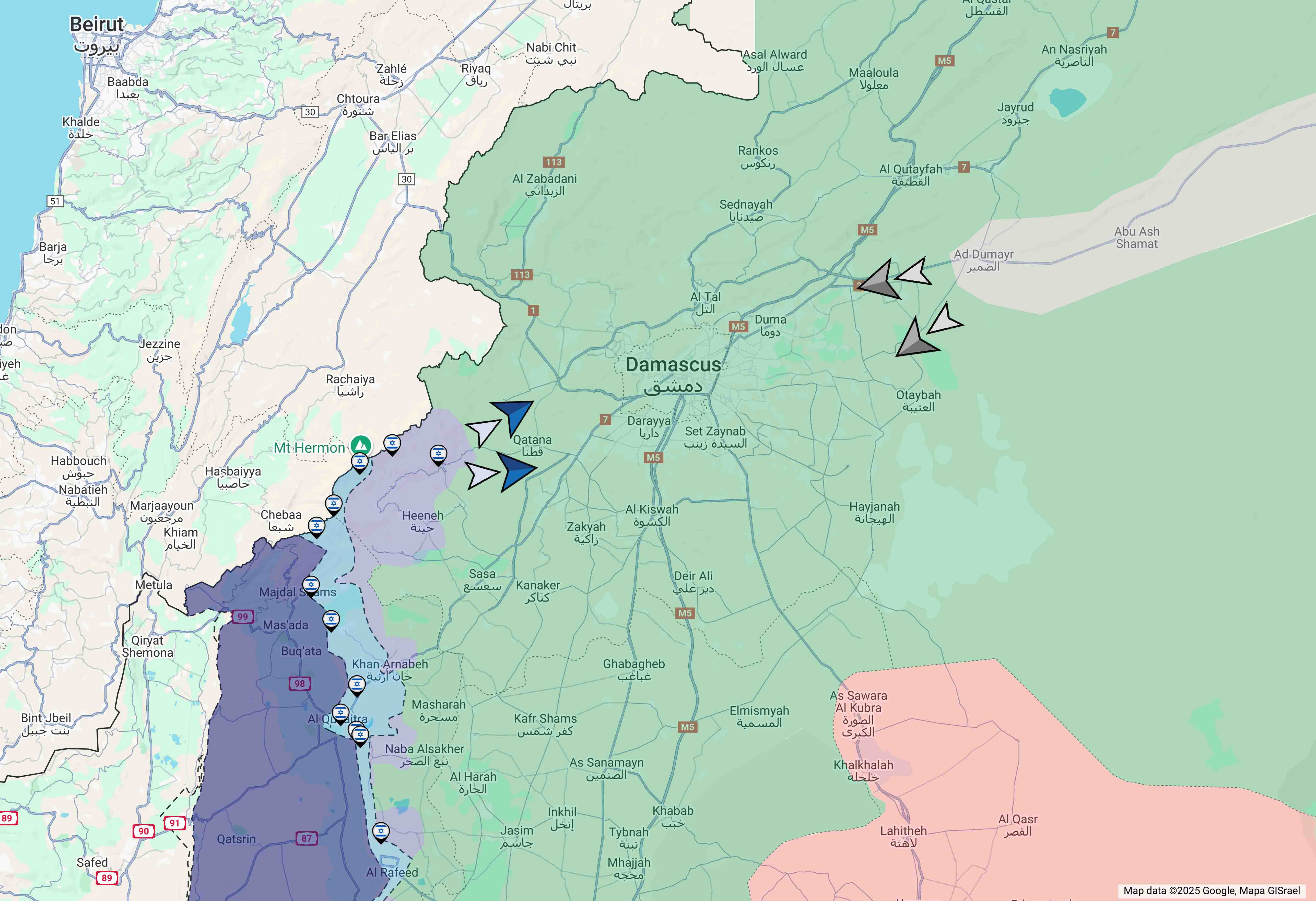 Israel prefers Syria to be partitioned with proxy elements—without direct military expenditure—but there are multiple variations on the strategy. During the Suwayda conflict, Israel dispatched a massive military convoy to Qatana, southwest of Damascus. It also carried out two airborne operations in Qalaat Jandal, also in Qatana, using Druze troops from Palestine. Today, Israel possesses a military force just 11 km from Damascus—effectively a spearhead, should it choose to strike the capital directly.