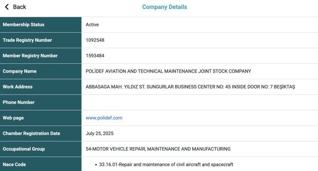 POLiDEF was established on 1 July 2021 as a hardware company owned by Ali Can Koc. It never engaged in any significant commercial activity, and it was removed from the Istanbul Chamber of Commerce register more than two years ago. Suddenly Mr. Ali Can Koc reappeared on 25 July 2025 (see the screenshot below) to re-register a new company with the same name but in the ‘engineering industry’. In just two weeks of ‘accumulated experience’, the company, born from the ashes of hardware, succeeded in winning contracts in the specialist aviation sector in Syria with claimed experience in the ‘repair and maintenance of spacecraft’.