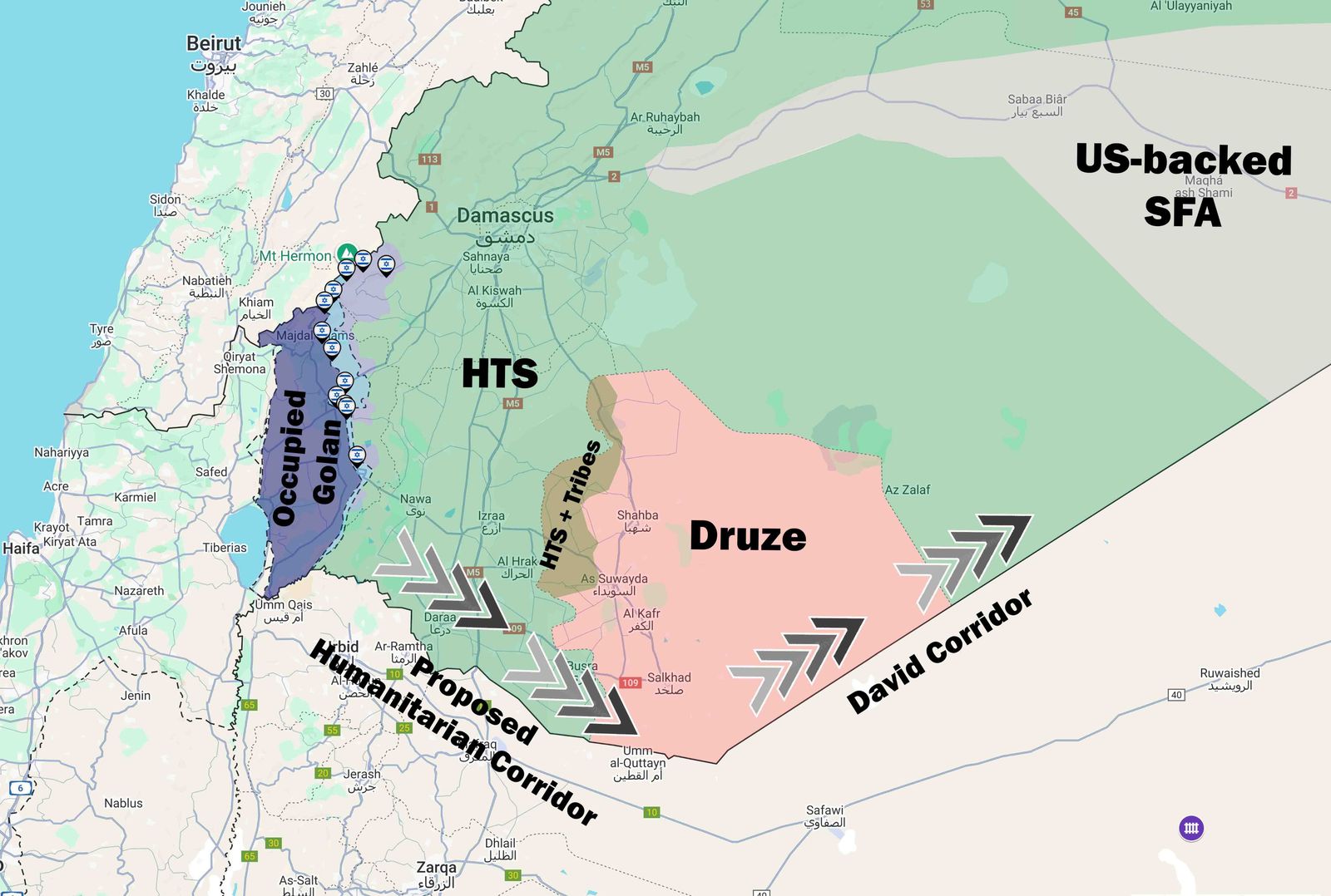 It should be understood that HTS has no objection to the Israeli long term objective to extend the land corridor — David’s Corridor — from Israel into Suwayda, passing through Daraa and Quneitra in the south. This territorial gain for Israel will form the bridgehead of the ambitious corridor project linking with the Kurdish-occupied areas east of the River Euphrates in the north.