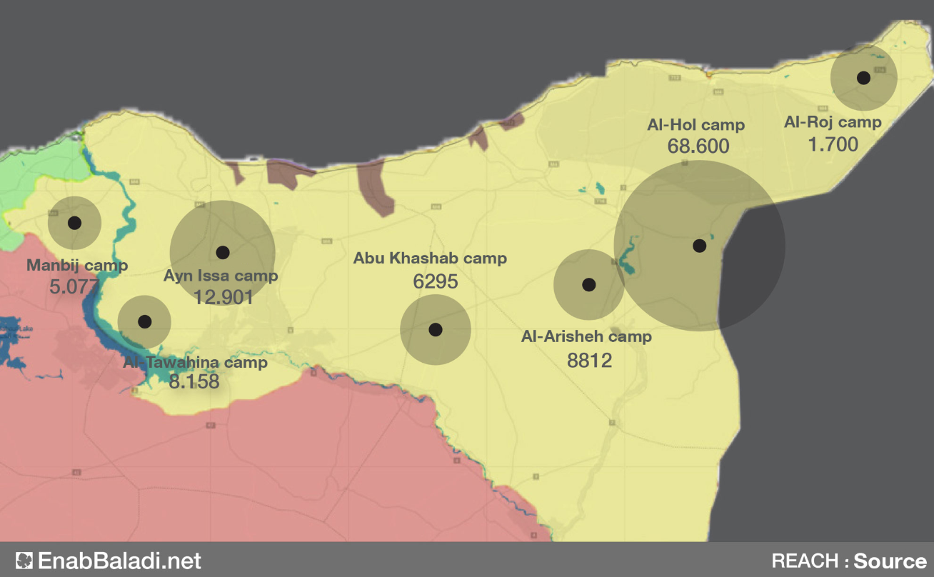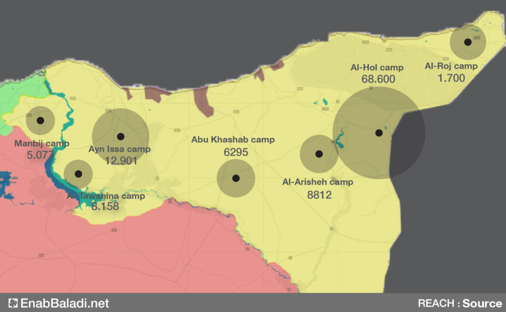 A 2019 map showing the location of ISIS holding camps in north-east Syria and the number of inmates.
